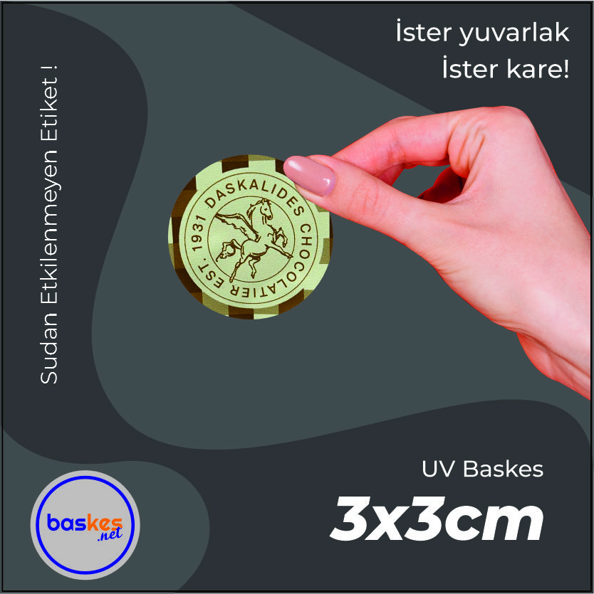 Dayanıklı ve canlı renklerle tasarlanan UV baskes etiketler, iç ve dış mekan kullanımına uygundur. Suya, güneşe ve çizilmelere karşı dirençlidir. Ürün ambalajı, promosyon veya kişisel tasarımlarınız için idealdir.
